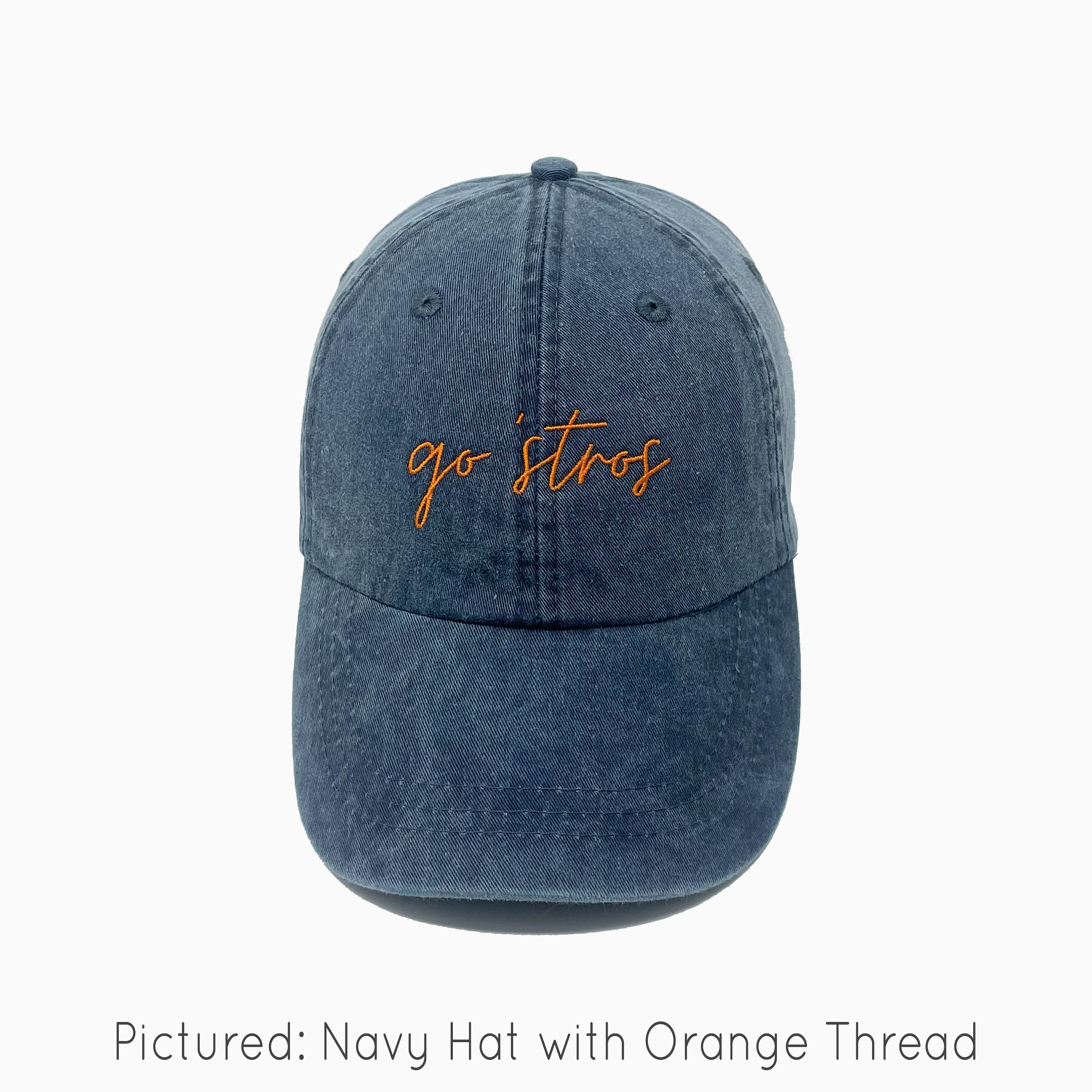 Pictured: Navy Hat with Orange Thread.
