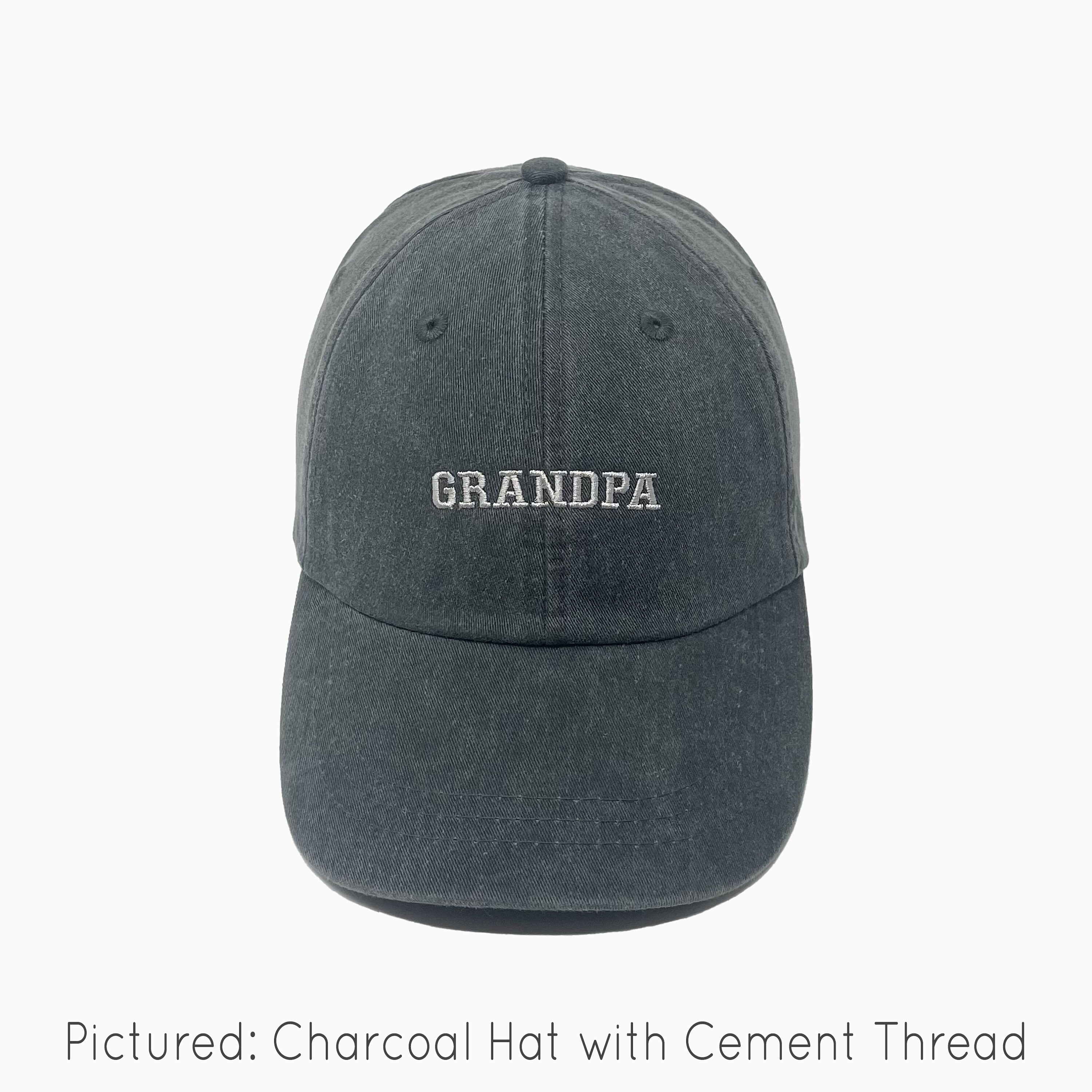 Pictured: Charcoal Hat with White Thread (First Picture). Charcoal Hat with Cement Thread (Second Picture).