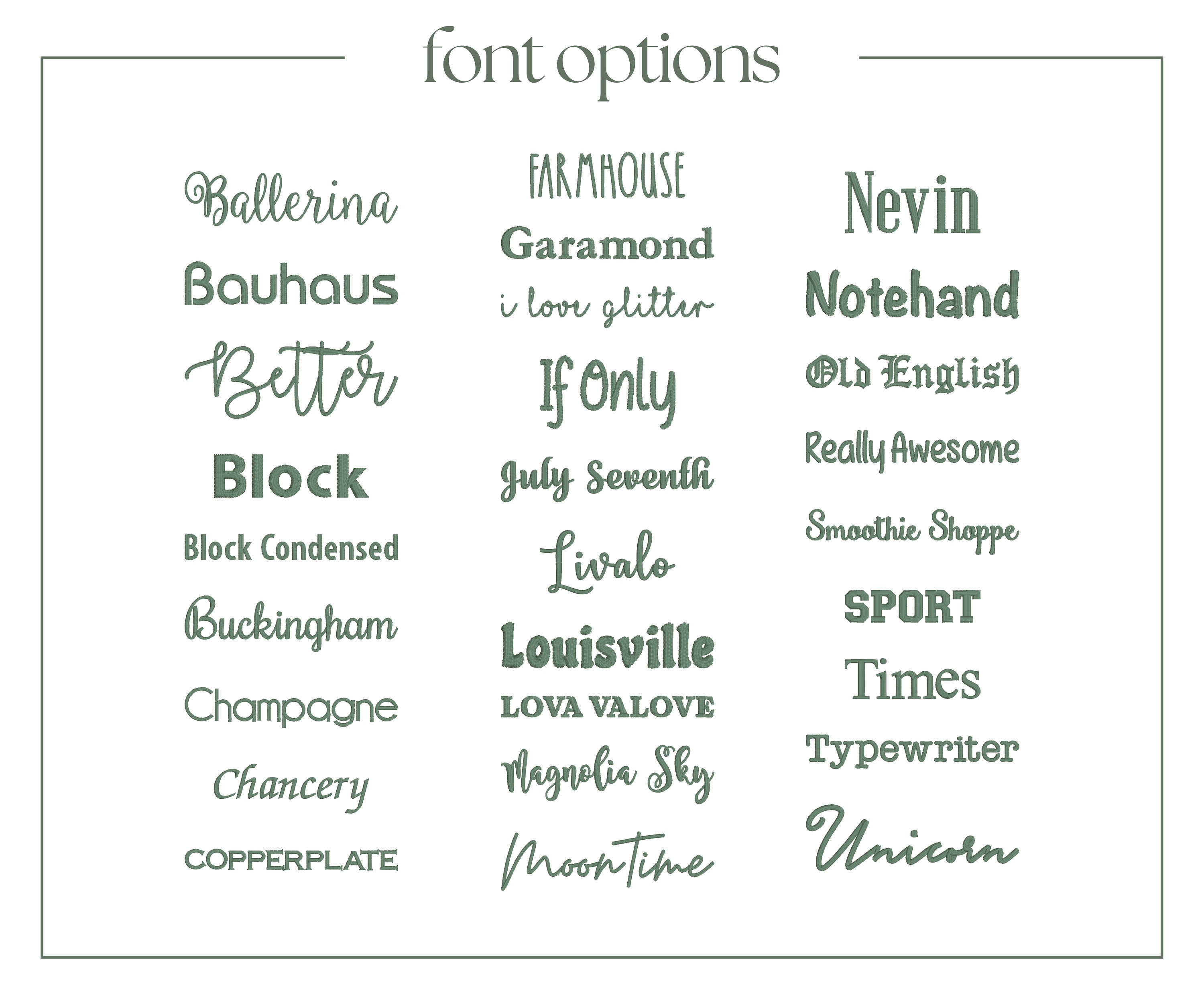 Failure to provide a font at time of purchase will delay processing as we cannot process any custom order without a font choice. We will reach out to confirm font choice, however if a font choice is not received by the date specified in our message then we will issue a cancellation of your order at that time.