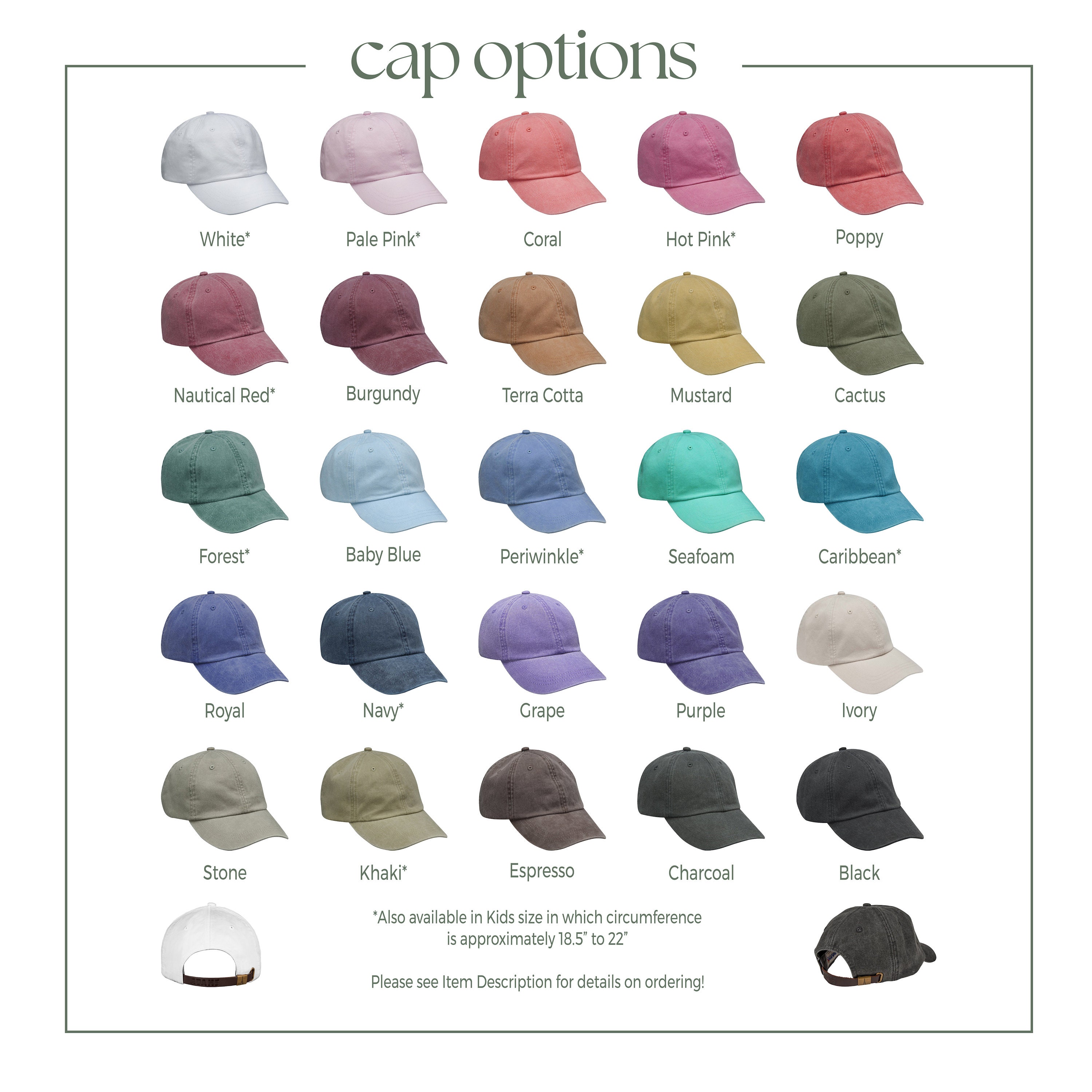 We use Adams brand caps that are made from high-quality 100% lightweight, breathable cotton; these are pigment-dyed and have a worn-in/lived in look to them similar to Comfort Colors! They are a perfect, everyday staple for all your outfits. On the back, there is a tuck-away leather back strap with antiqued brass buckle and grommet to size it how you'd like it to fit!