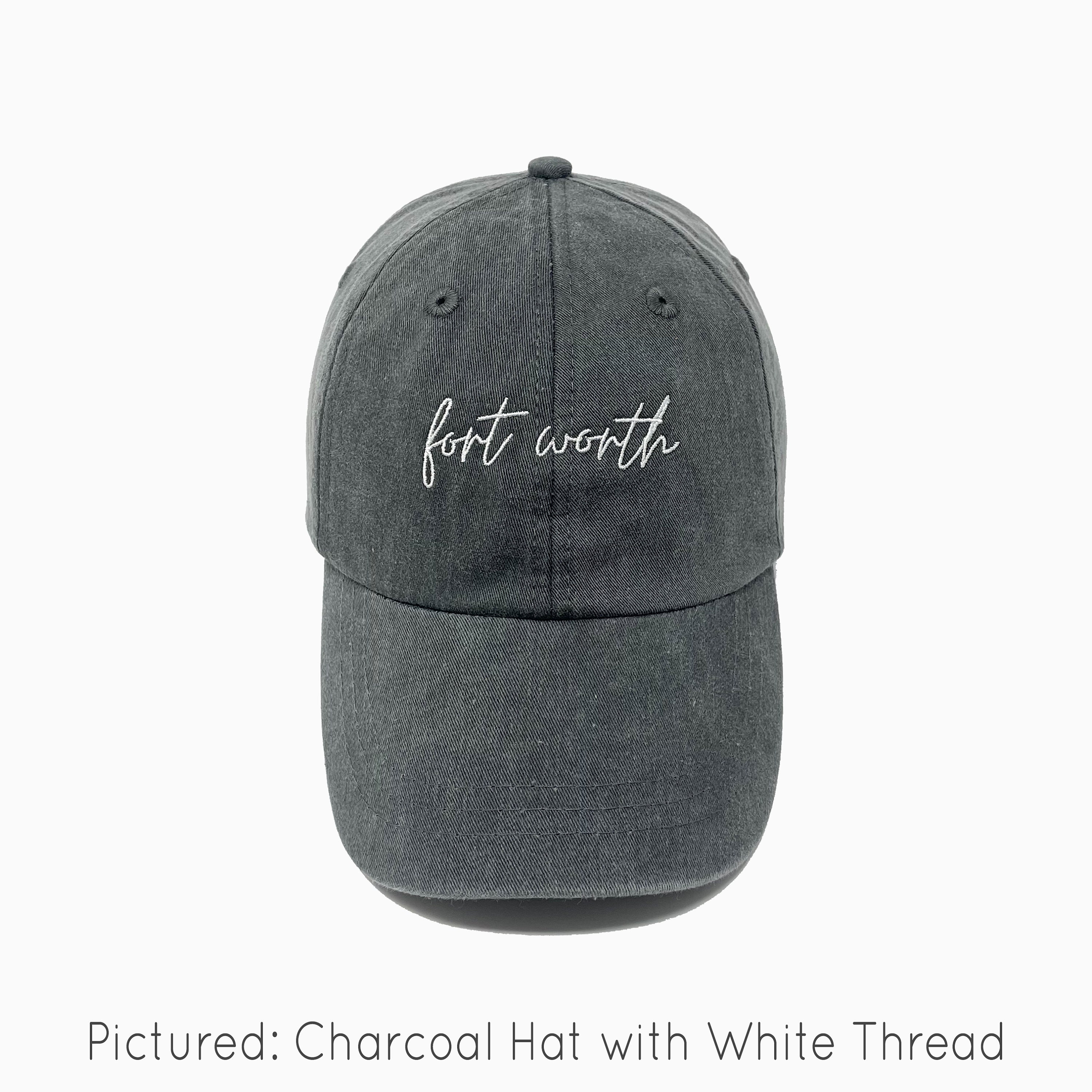 Pictured: Charcoal Hat with White Thread.