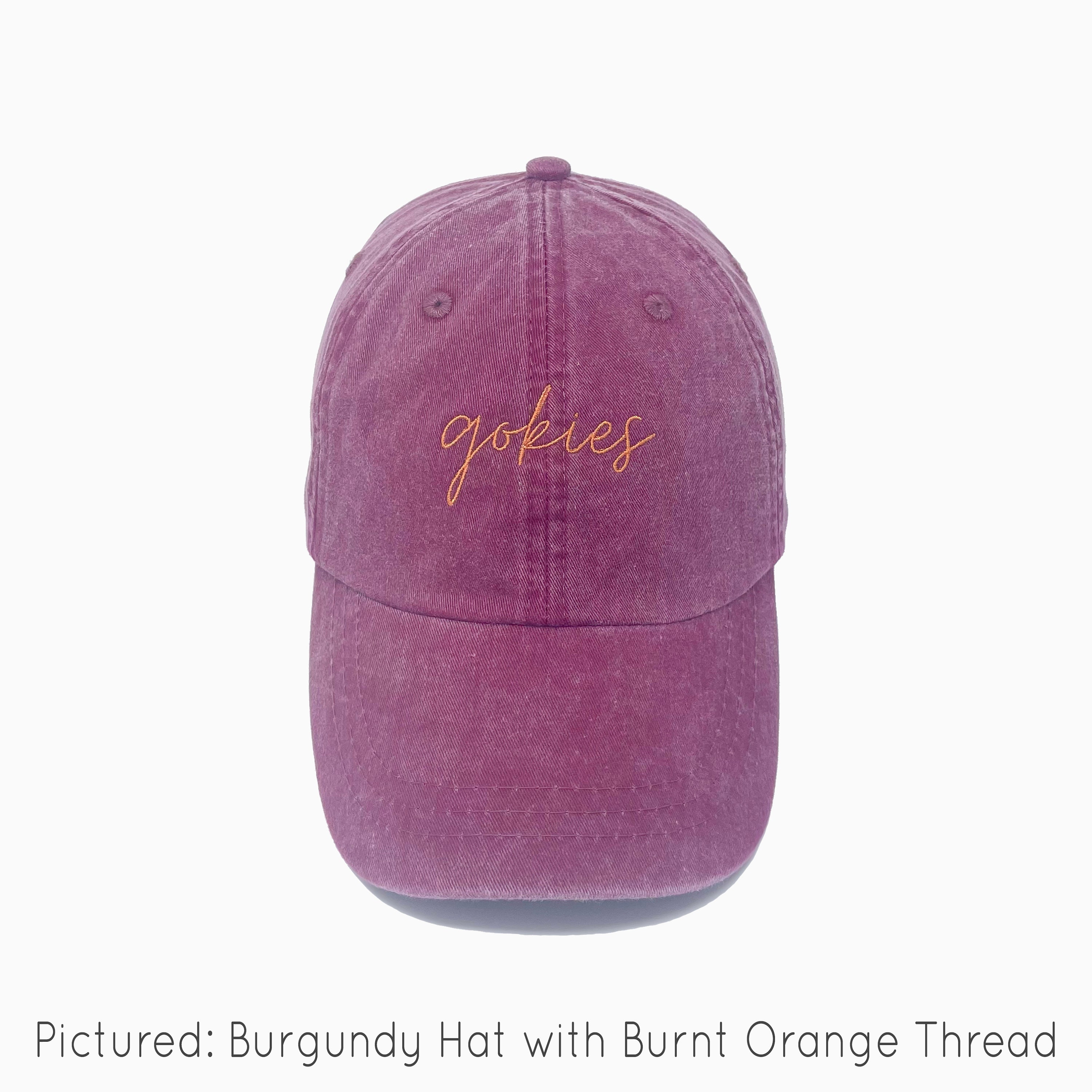 Pictured: Burgundy Hat with Burnt Orange Thread.
